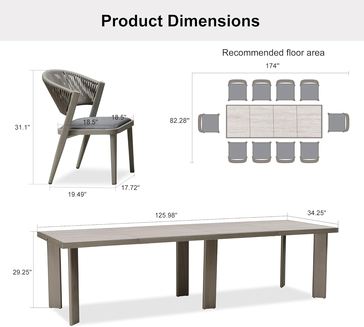 1. Dining Set Dimensions: This outdoor dining set includes 10 dining chairs and 1 rectangle table. Table size: 125.98"L x 34.25"W x 29.92"H. Chair size: 19.69"D x 17.72"W x 31.1"H. Chair capacity: 300lbs.