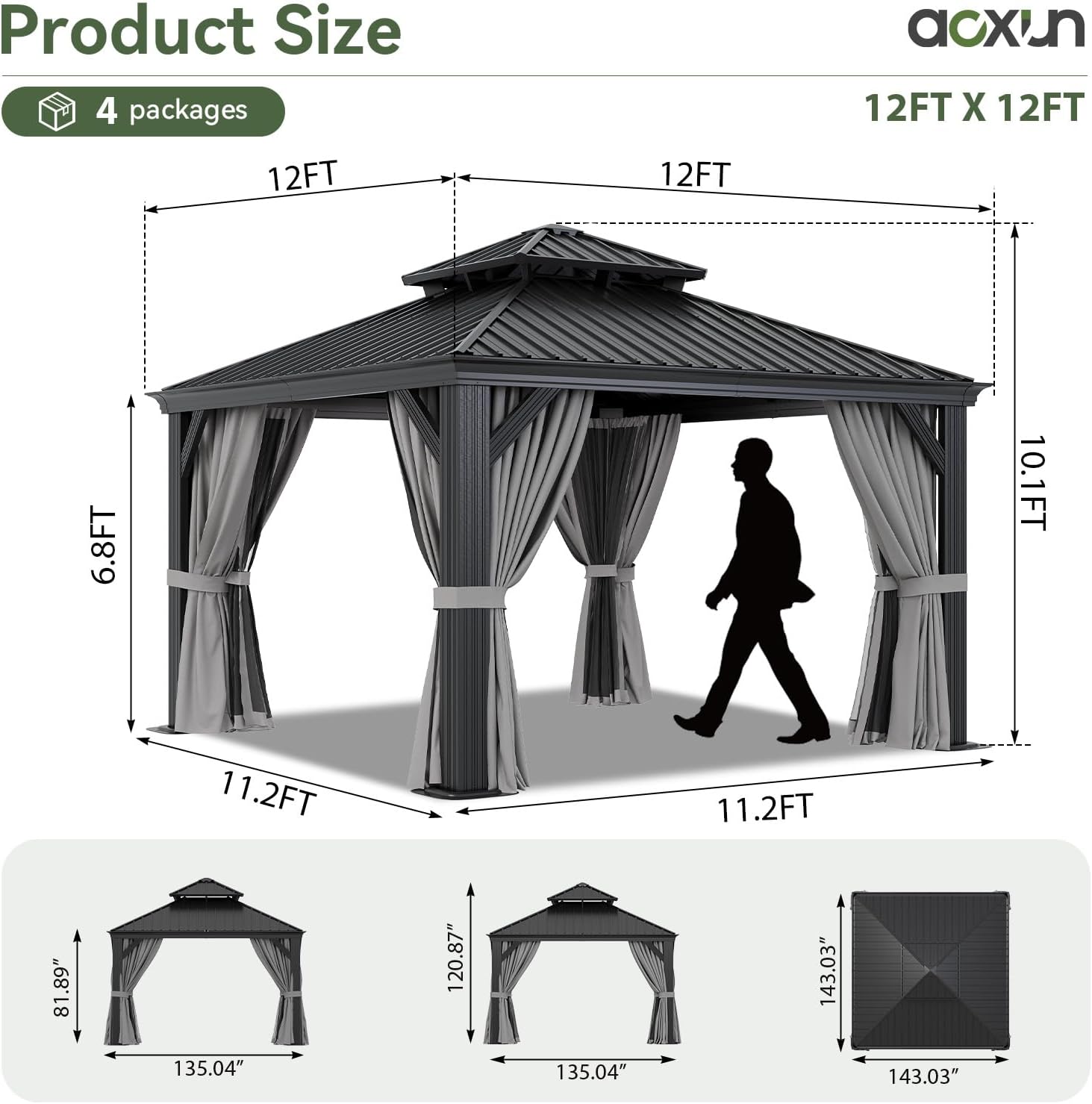 - Aoxun 12' X 12' Hardtop Gazebo with Drainage System, Aluminum Outdoor Gazebo with Galvanized Steel Double Roof, Patio Permanent Metal Pavilion with Netting, for Garden, Deck, Grey B0DWF5JKXG