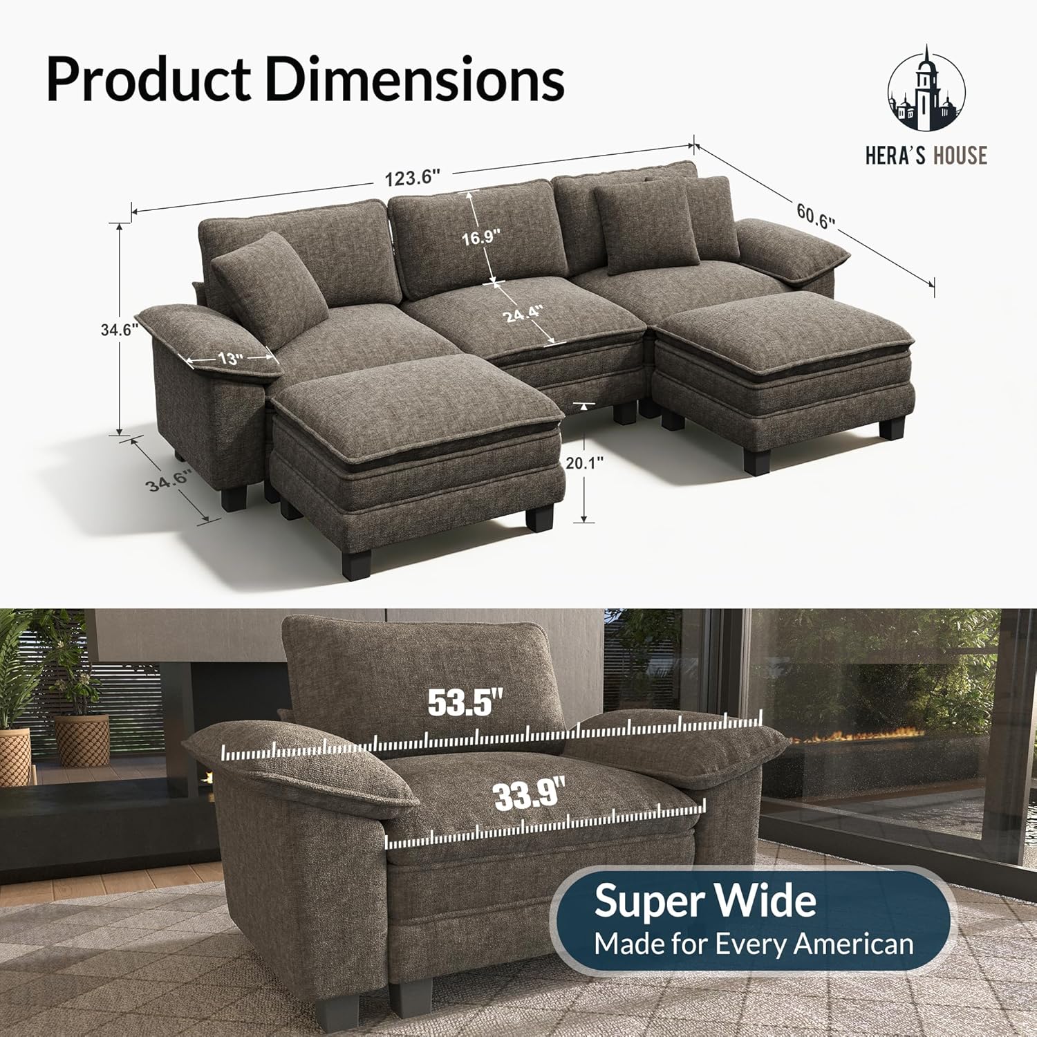 - HERA'S HOUSE 124" Modular Sectional Sofa, Oversized U Shaped Couches for Living Room, Comfy Cloud Couch with Ottoman, 5-Seater Deep Seat Sofa with Throw Pillow, Chenille Ash B0FT83DQ7W