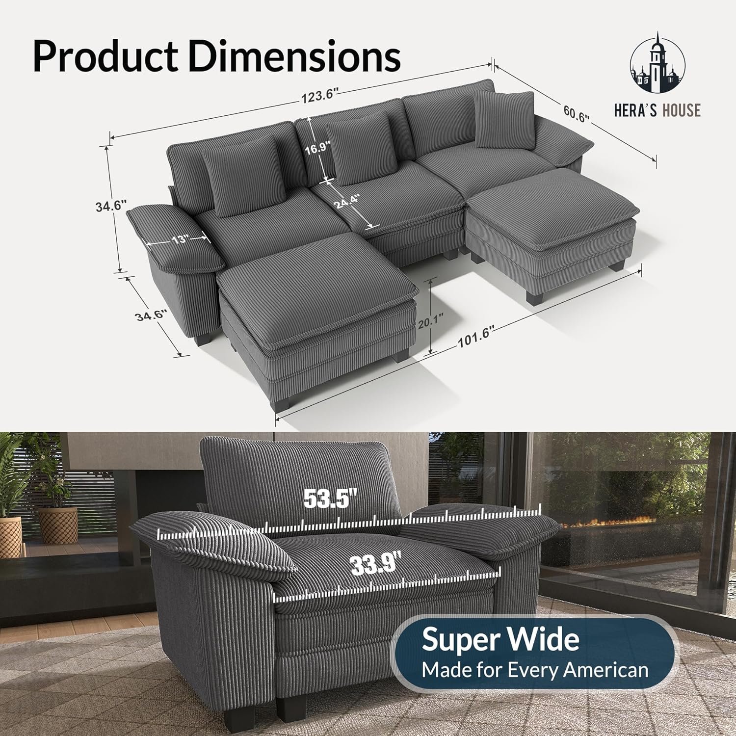 - HERA'S HOUSE 124" Modular Sectional Sofa, Oversized U Shaped Couches for Living Room, Comfy Cloud Couch with Ottoman, 5-Seater Deep Seat Sofa with Throw Pillow, Corduroy Grey B0FBRM643J