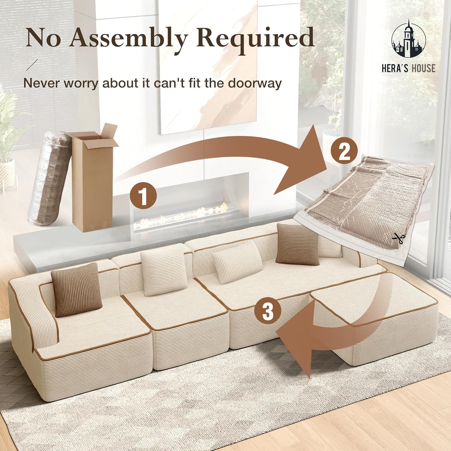 - HERA'S HOUSE 134" Cloud Sectional Couch, L-Shaped Modular Upholstered Sofa with Ottoman, Corduroy Boneless Couches with Wide Armrest and 5 Throw Pillows for Living Room, No Assembly Required, Beige B0G4VVL6K9