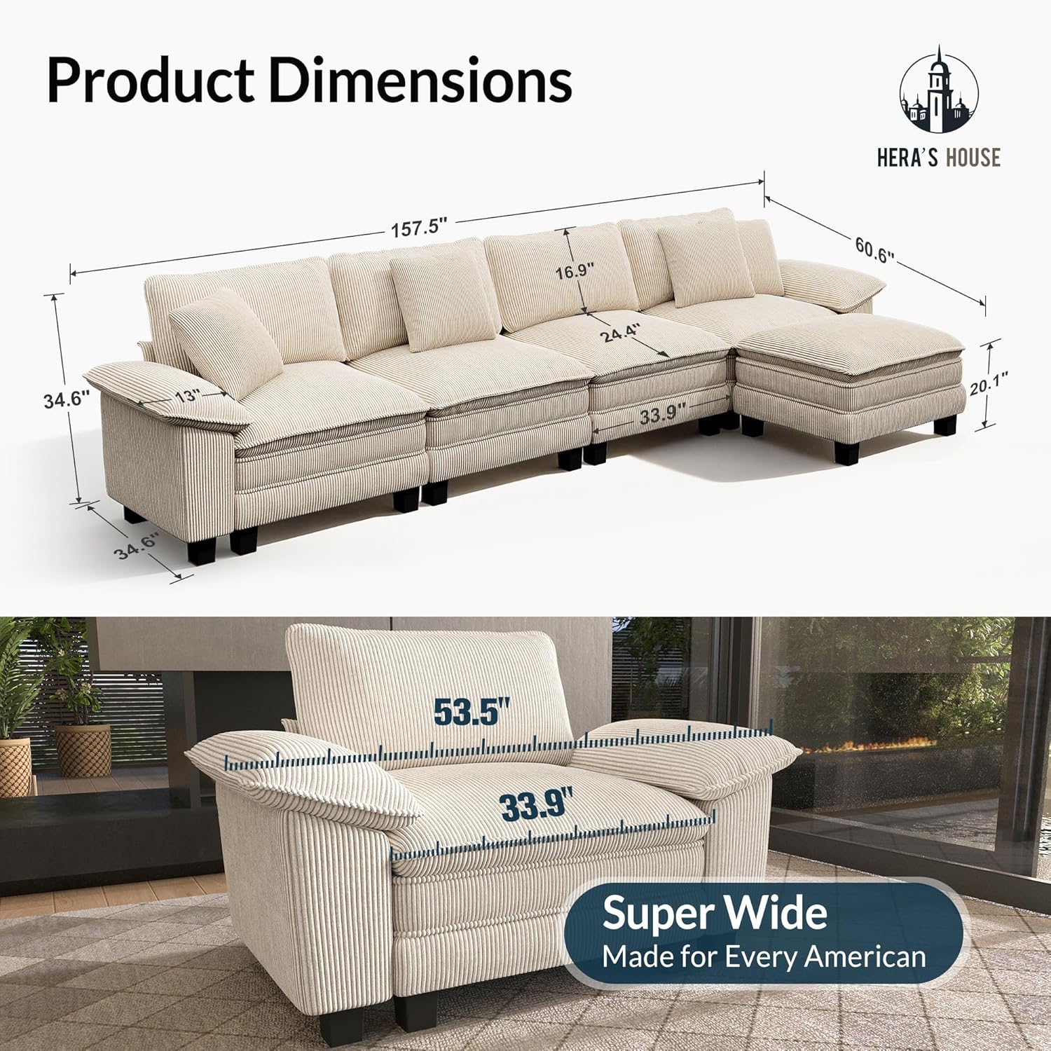 - HERA'S HOUSE 158" Modular Sectional Sofa, Oversized L Shaped Couches for Living Room, Comfy Cloud Couch with Ottoman, 5-Seater Deep Seat Sofa with Throw Pillow, Corduroy Beige B0FBRJB3CF