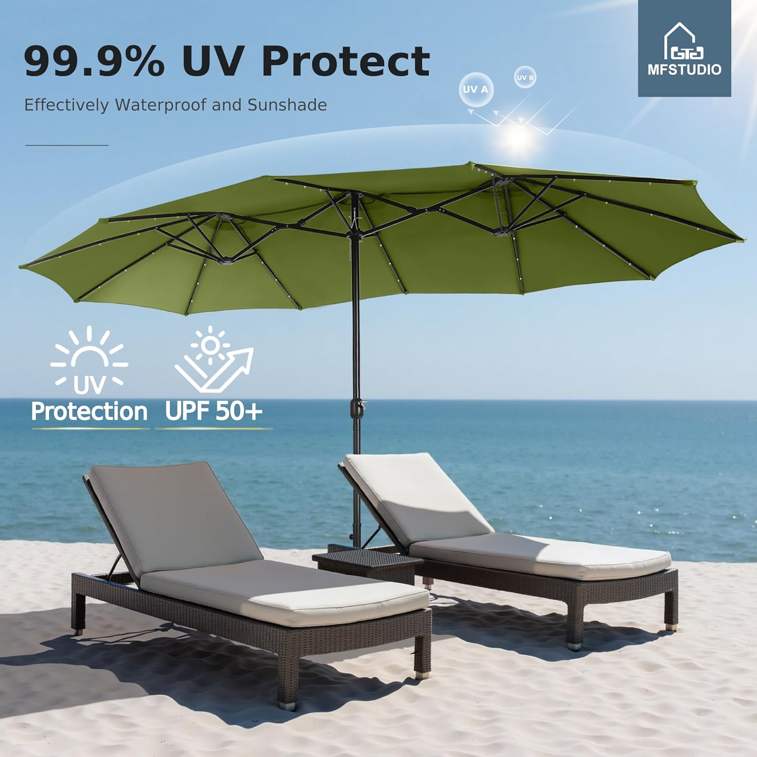 - MFSTUDIO 15ft Double Sided Patio Umbrella with Solar Lights, Outdoor Large Umbrellas with Crank Handle and 36 LED Lights, Rectangular Market Umbrella with Base Included for Deck Pool Shade, Lime Green B0CWTKGQR6