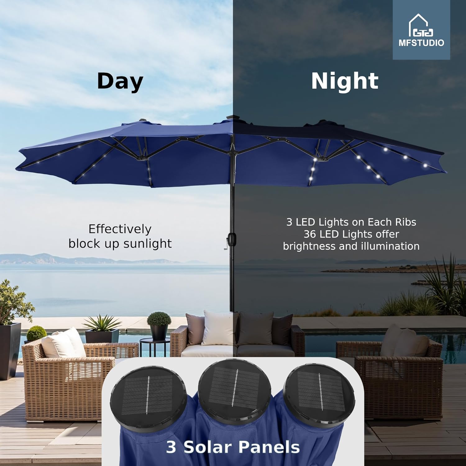 - MFSTUDIO 15ft Double Sided Patio Umbrella with Solar Lights, Outdoor Large Umbrellas with Crank Handle and 36 LED Lights, Rectangular Market Umbrella with Base Included for Deck Pool Shade, Navy Blue B08D3CTJ4G