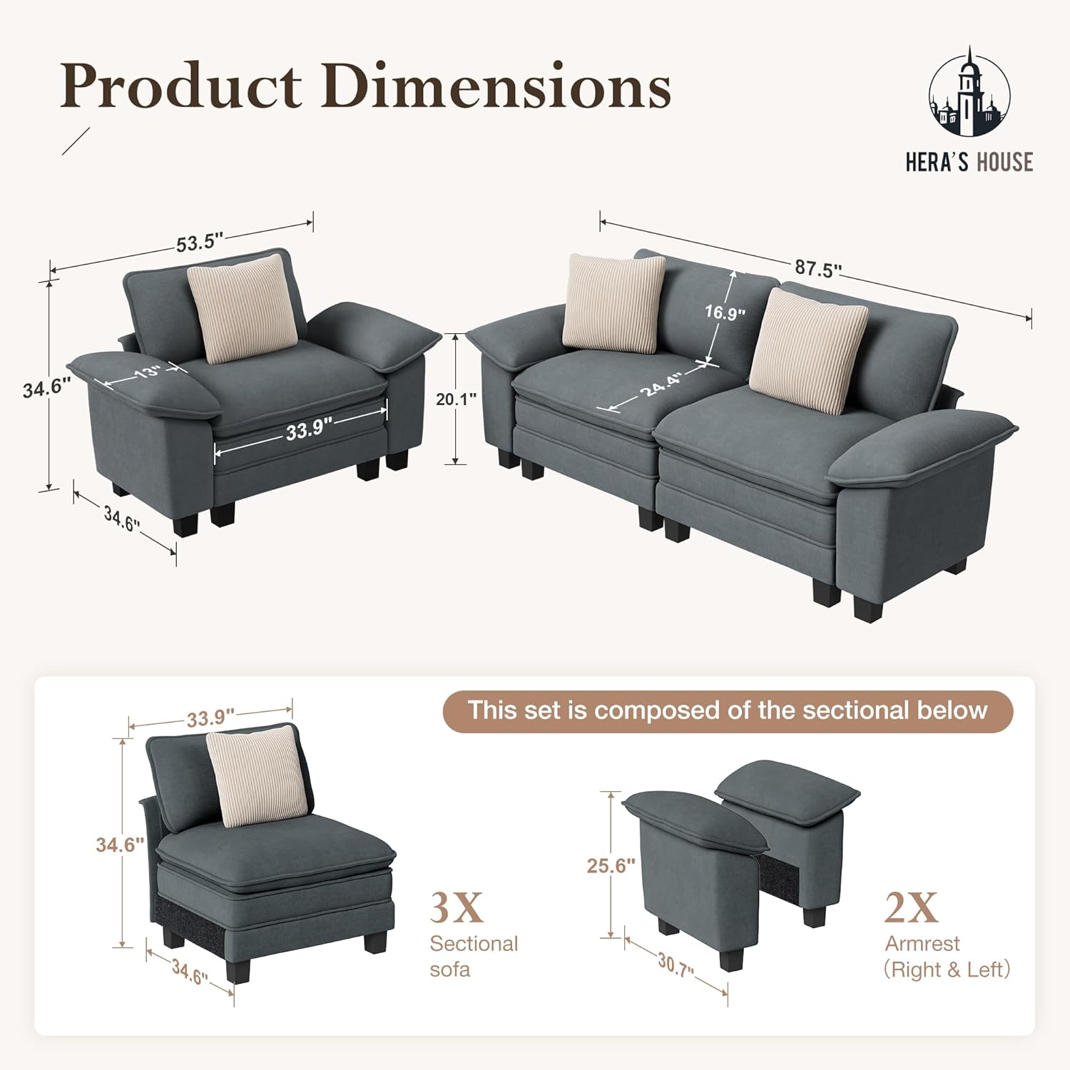 - HERA'S HOUSE 2 Pieces Modular Sectional Sofa Sets, Oversized Couch Set with Loveseat and Armchair, Comfy Cloud Couches with Throw Pillows, 3-Seater Deep Seat Sofa for Living Room, Chenille Blue B0FBRJMNMR