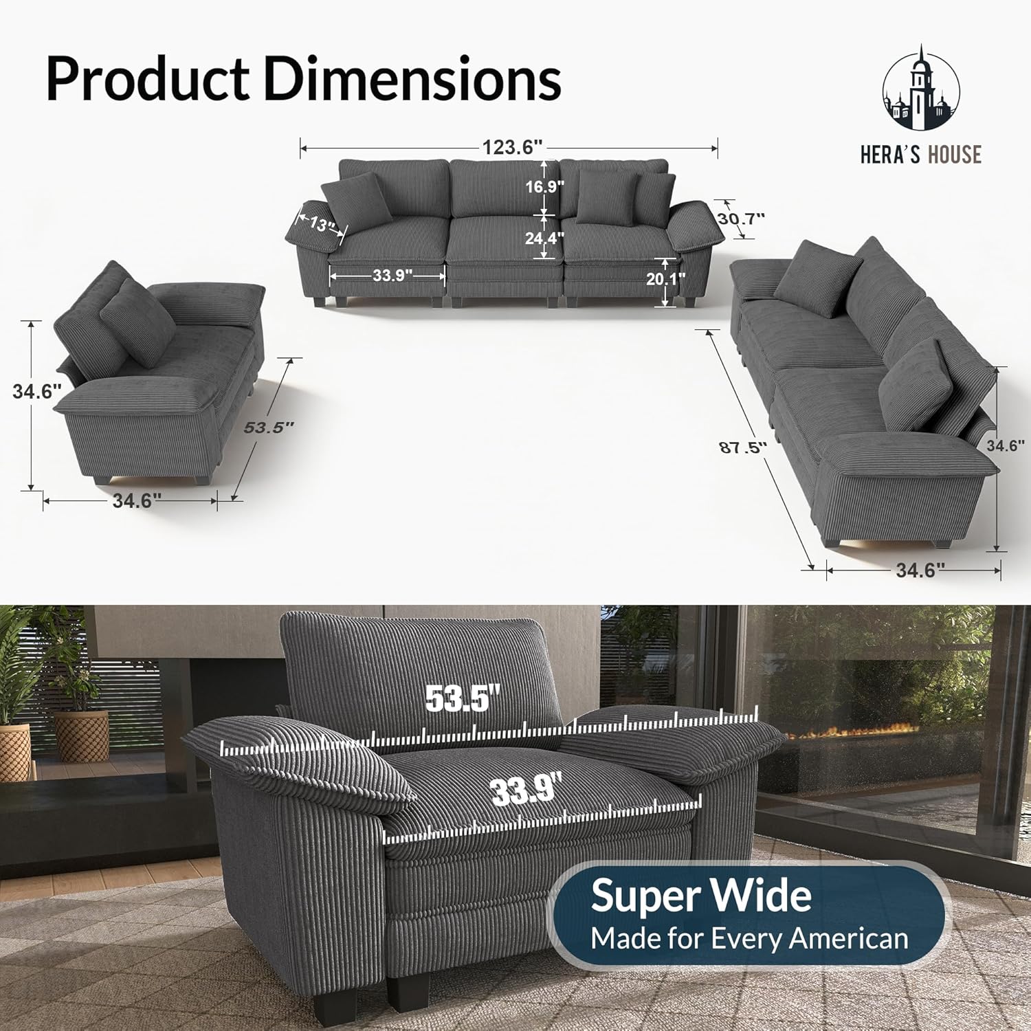 - HERA'S HOUSE 3 Pieces Modular Sectional Sofa Sets, Oversized Couch Set with Loveseats and Armchair, Comfy Cloud Couches with Throw Pillows, 6-Seater Deep Seat Sofa for Living Room, Corduroy Grey B0FT7JD783