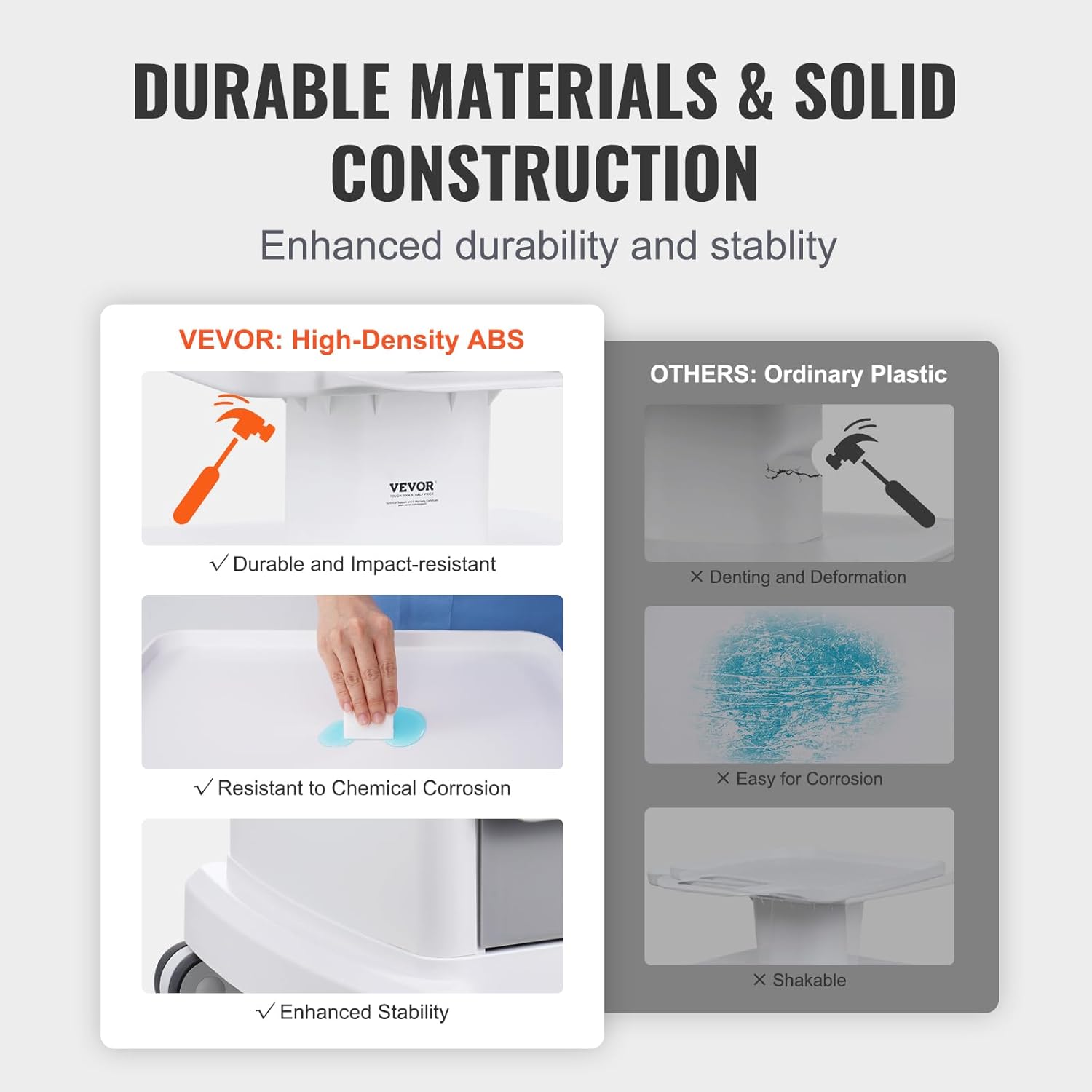 - Durable Material: Excellent impact and chemical corrosion resistance ensure the medical cart remains like new for long periods, reducing maintenance costs. Made from high-density ABS material and reinforced with internal steel plates.