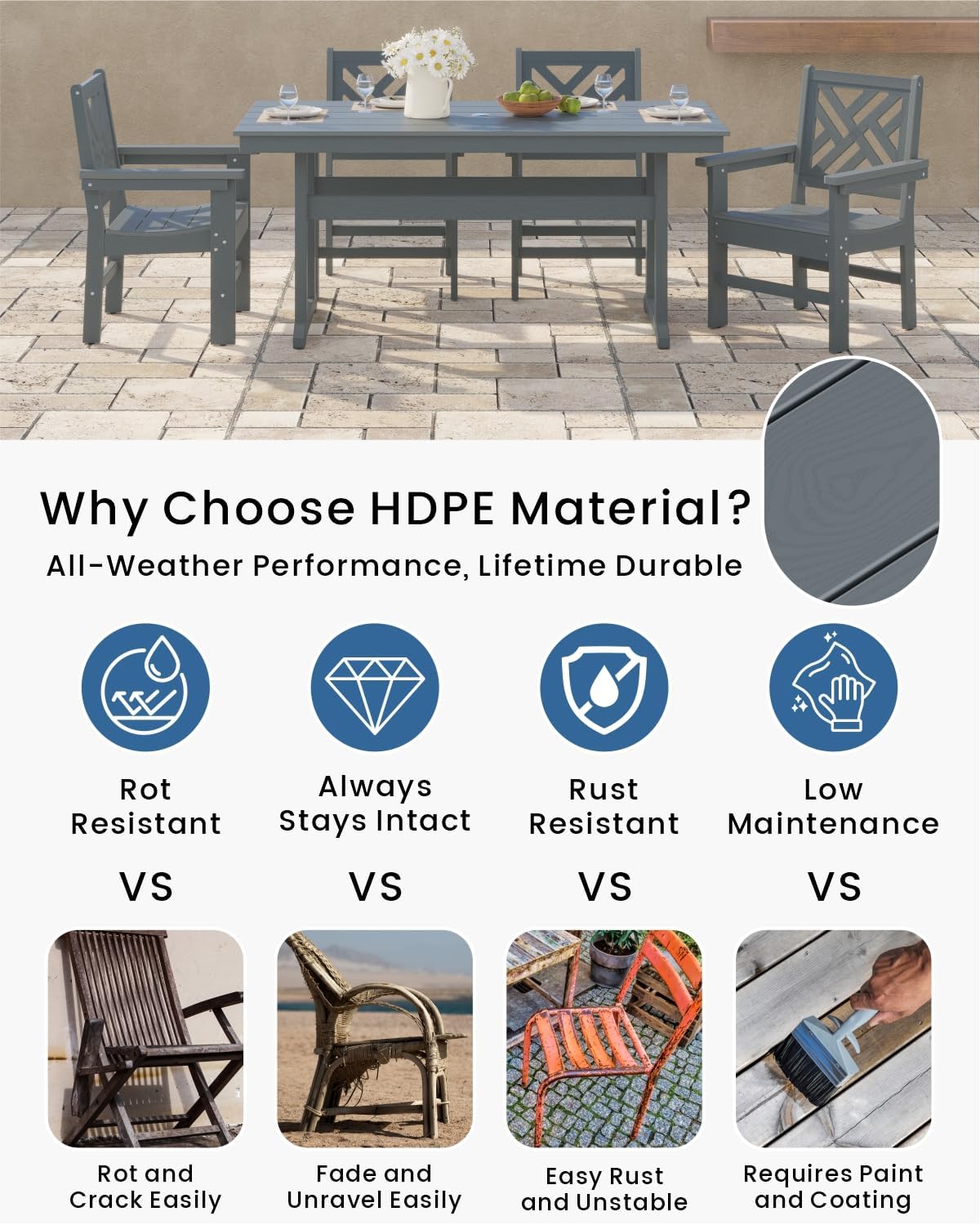 2. HDPE Outdoor Dining Set: Made from high-density polyethylene (HDPE), a robust, weatherproof polymer; Unlike wood, metal and wicker, it resists splintering, cracking, peeling, rotting, and rusting—making it the ideal choice for outdoor furniture