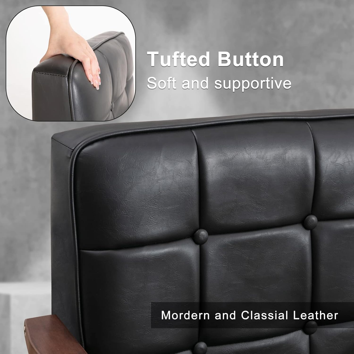 1.【Modern Retro Design】Mid-Century Retro Modern upholstered accent chair, classical leather and solid wood armrests, combined with button-tufted design, perfect addition to the living room, bedroom, waiting room, guest room.