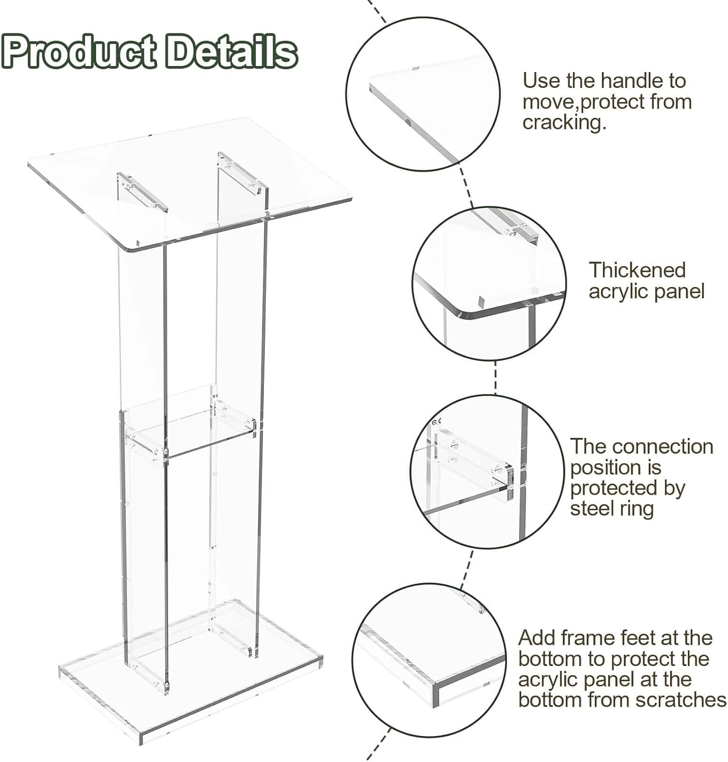 Details: Acrylic Clear Lecterns Podium Stand, 24" L x 16" W x 50" H - Pulpits for Classrooms, Weddings, Churches, Conference, Speeches, Professional Presentation Podiums with Storage Shelf (Transparent) Podio de acrílico transparente, 24" L x 16" W x 50" H - Púlpitos para aulas, bodas, iglesias, conferencias, discursos, podios de presentación profesional con estante de almacenamiento (transparente)