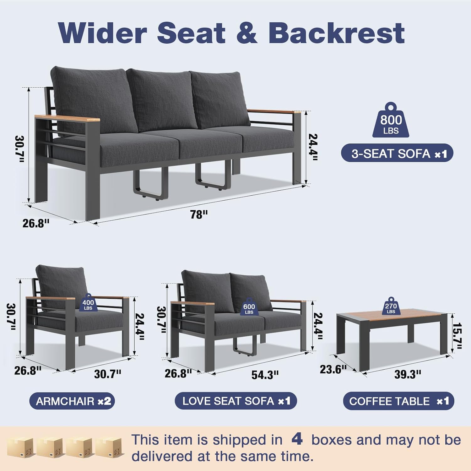 1. 【UPGRADED】① Wider 26 in seat & Thicker 5 in cushion, (industry standard 24 in & 13 in); ② Reinforced Structure, Hurricane-grade steel frame with thickened support beams; ③High-end aluminum with heat treatment wood grain coating, more fashionable and reduce the metal heat in summer, protect the skin; ④Top Olefin fabric, easy to clean, ten years without fading