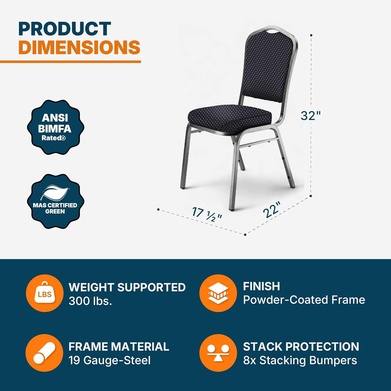 Details: 【 THE BACK UPHOLSTERED BANQUET CHAIRS (2 PACK) 】 Elevate hospitality and institutional spaces with premium commercial seating designed for daily use. The taller silhouette back with 2 inch high-density foam and a contoured seat provides supportive, easy-clean comfort in fabric or vinyl upholstery—ideal for banquet halls, churches, synagogues, hotels, restaurants, conference rooms, lobbies, and waiting areas where tidy appearance, wipe-clean maintenance, and all-day guest comfort matter. Built for contract-grade durability, the OEF9300 Series uses 7/8 inch square 18-gauge steel with 5/8 inch under-seat H-braces, stacking bars with 12 protective bumpers, and floor-safe glides to help minimize scuffs and noise. The resilient powder-coat frame is offered in Black Santex (BT) and Silvervein (SV), with optional ganging device (PGC81) and felt glides (GL90-FT) for flexible layouts and added floor protection—perfect for venues, rental fleets, and facilities teams. For smooth logistics and storage efficiency, the 2 pack stacks securely for compact closets, faster room resets, and streamlined inventory control. Larger sets move easily on OEFDY81 and OEFDY-9000 dollies to cut trips, speed changeovers, and protect finishes—an efficient choice for catering, worship spaces, auditoriums, cafeterias, classrooms, training rooms, and event rental operations managing high-volume seating. 【 CERTIFIED QUALITY & BACKED BY 5-YEAR WARRANTY 】 Tested by UL Solutions to meet ANSI/BIFMA standards for strength, safety, and long-term performance. MAS Certified Green® for low VOC emissions and healthier indoor air quality. Backed by a 5-year limited warranty and U.S.-based customer support for dependable peace of mind.