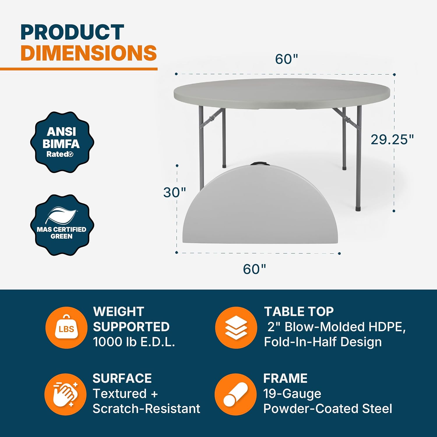 - OEF Furnishings OEFCMFIH60R Commercial-Grade Premium Industrial Fold-in-Half Blow-Molded Folding Table with 19-Gauge Steel Frame and Thick Top (60" Diameter, Speckled Gray Top) B0DJ3CBGLK