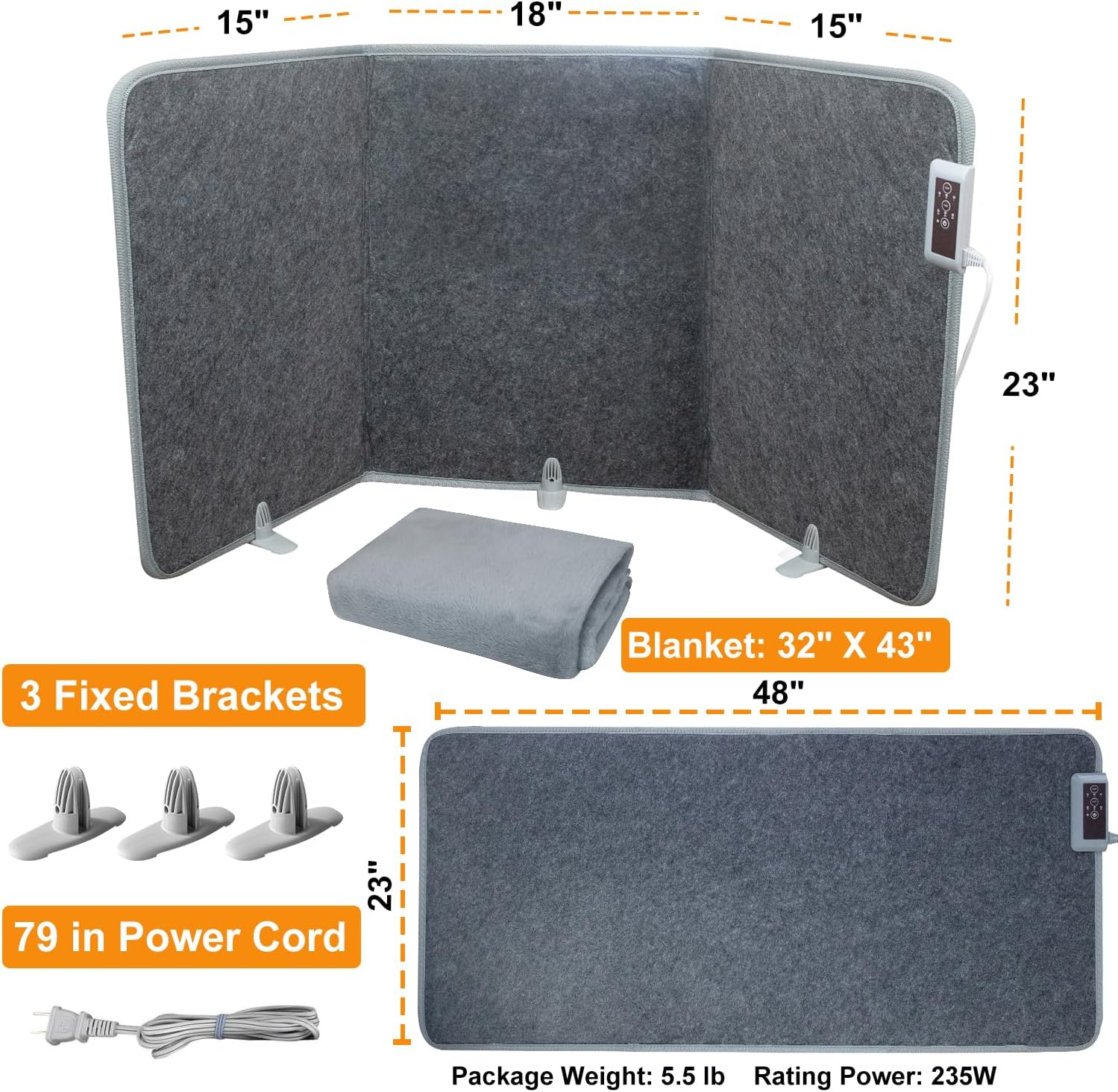 5.【The fabric panel heater includes】1) The unfolded size of standing heater is long*height 48in*23in, folded size: 18in*23in; 2) 79" extra long cord; 3) 3 brackets can help secure the product firmly. Controller is positioned upward, making it more convenient to operate. You can get warmth with just one click! The heater is foldable, easy to store. The heater has gentle heating, no light, no noise, no dry air, no odor, touchable and safe, pets kids friendly.