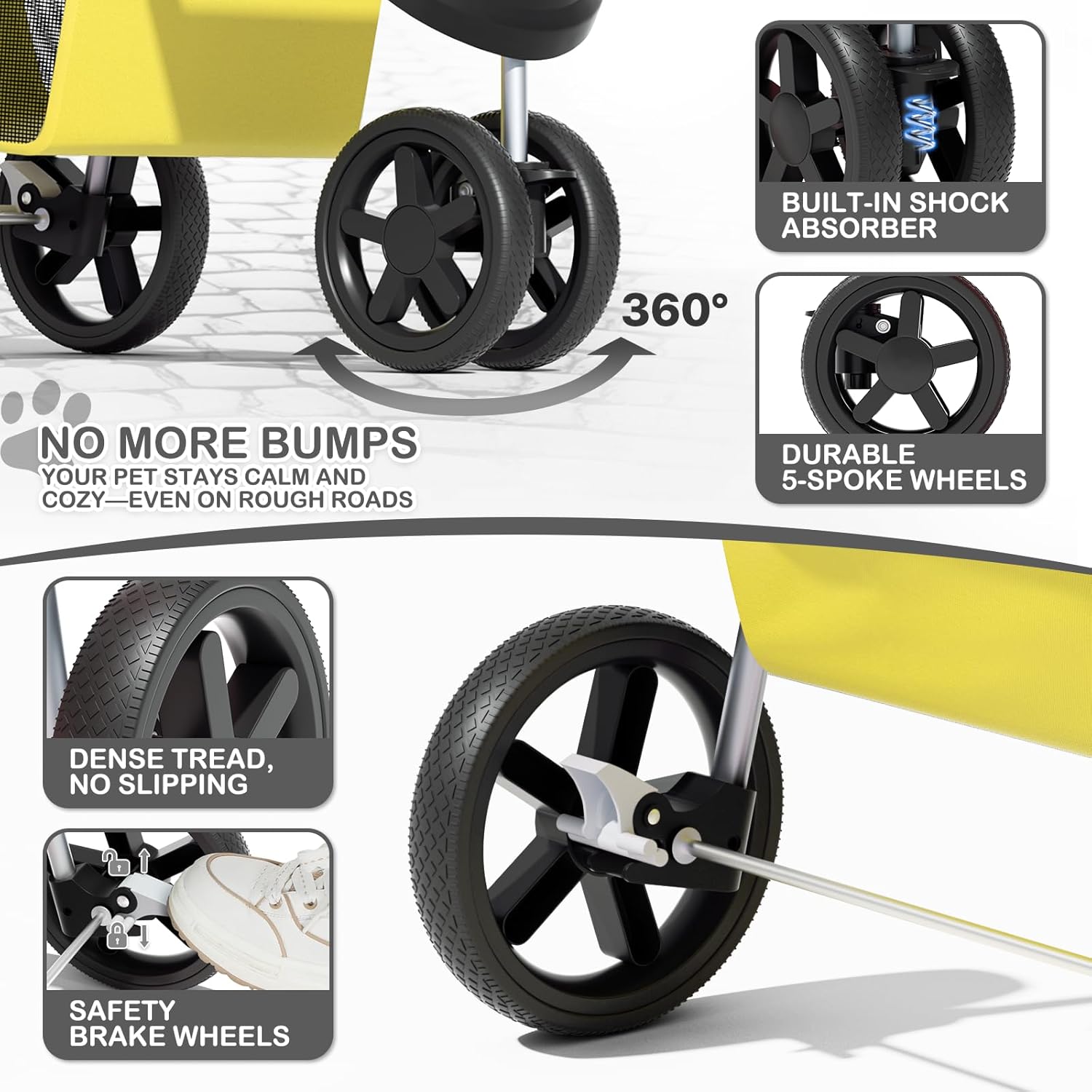 4. Advanced Braking System - The two rear wheels of our pet stroller are equipped with brake protection devices, so you can park your stroller safely and securely even on inclined surfaces.