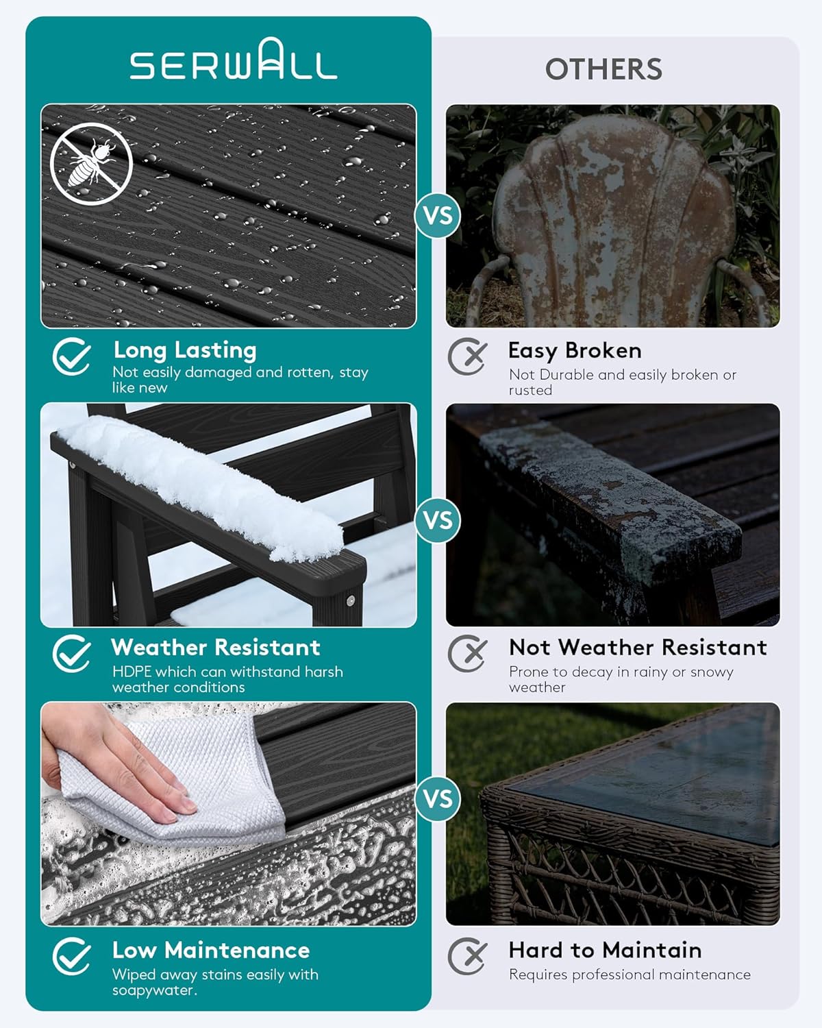 6.【Low Maintenance】HDPE dining table sets required low maintenance. Unlike the Steel dining sets may require rust prevention, this patio dining table and chairs are easy to clean with just soap and water, requiring minimal effort to keep them looking fresh.