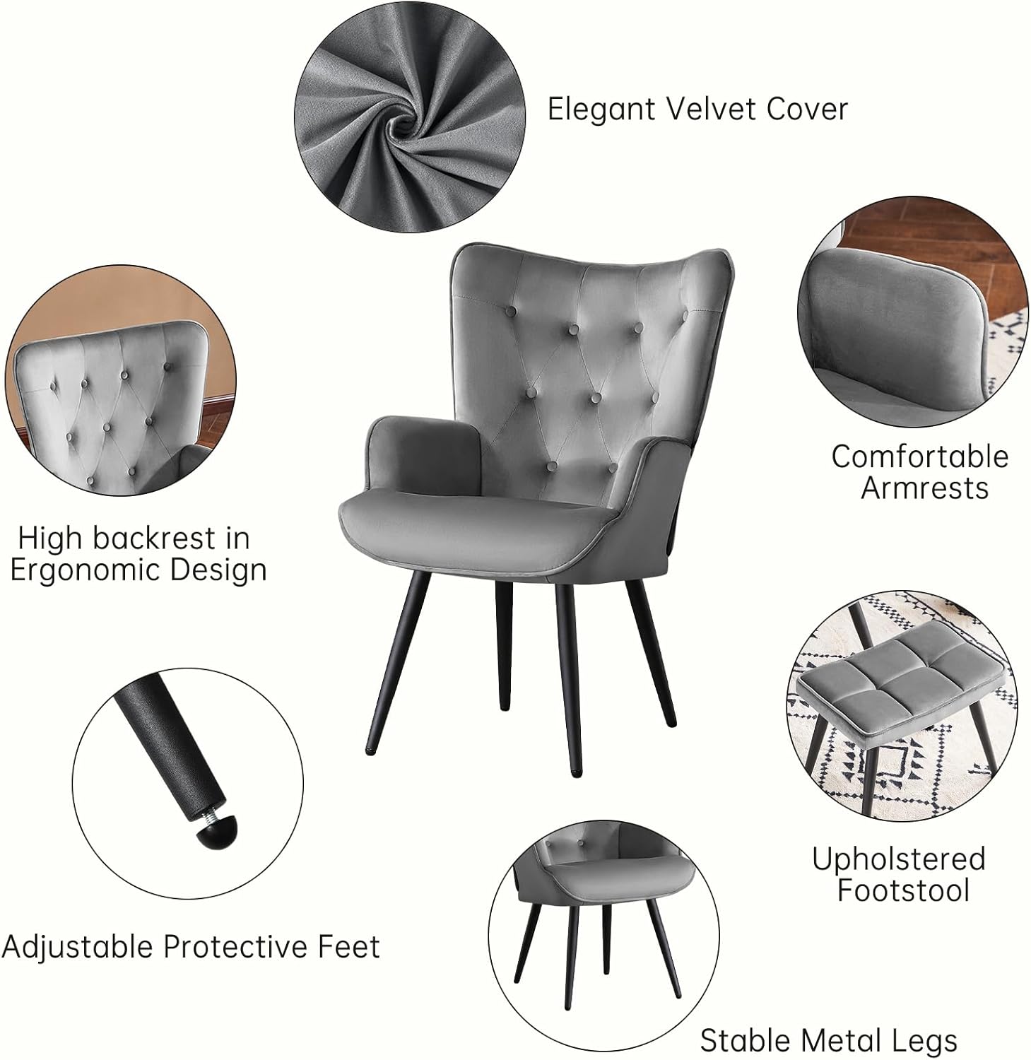 - Furniliving Modern Accent Chair with Ottoman, Upholstered Reading Chair with Ottoman Set, Wingback Chairs with Backrest & Metal Legs, Tufted-Button Armchair for Bedroom, Living Room, Velvet, Grey B0GWDLZFWD