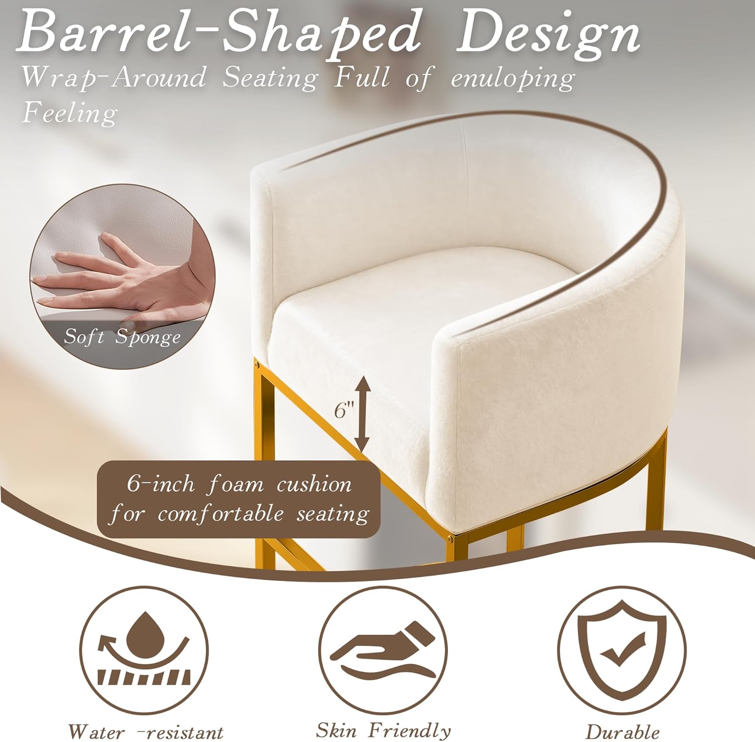 1. [Barrel Shape Modern Design]:The counter stool adopts a bucket shaped bathtub design, with a round back contour reflecting classic charm and modern style. In addition, bucket shaped cushions surround your body, giving your back a feeling of being surrounded and wrapped, providing a better seating experience.
