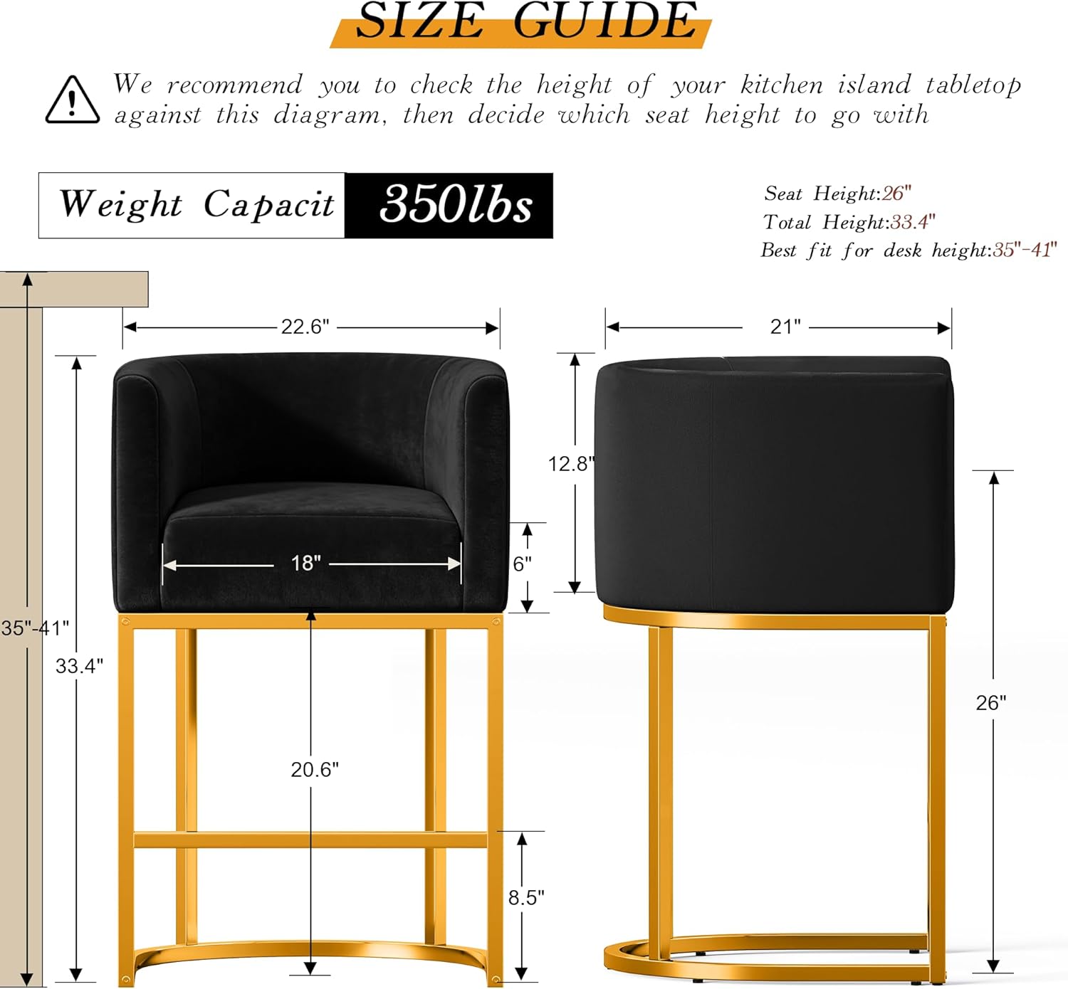 Details: MODERN BUCKET STYLE DESIGN: The counter stool adopts a bucket shaped bathtub design,with a round back contour reflecting classic charm and modern style. In addition, bucket shaped cushions surround your body,giving your back a feeling of being surrounded and wrapped, providing a better seating experience. RELAX AND BE COMFORTABLE: This bar chair cushion is filled with high resilience sponge, creating a very soft and comfortable long-term seat. At the same time,the backrest and armrests provide sufficient back support for your back. You can rest comfortably on the back of the chair,feeling very comfortable. REFLECTING THE PRINCIPLES OF ERGONOMIC DESIGN: The dimensions are 22.8 inches long, 20.7 inches wide, 33.5 inches deep,and the seat height is 26 inches. It is suitable for kitchen islands and bar counters that are 35-40 inches high. In addition,the foot pedal can also serve as additional support to relax the legs. DURABLE STRUCTURE AND RELIABLE QUALITY: The bar stool at the counter height is made of a tubular metal frame, which has the advantage of ground support. In addition,it has a stable and more stable foot pedal design that can relax your legs and make the bar chair more sturdy and reliable. The bar stool is equipped with pre assembled pads to protect your floor from scratches. SUITABLE FOR MATCHING IN VARIOUS ENVIRONMENTS: These bar stools have simple and beautiful lines,and are decorated with fabric and PU leather,adding a stylish and elegant appearance to any room. They match various decorative styles and can be used in various places. You can put them in the kitchen,living room, home bar,restaurant,coffee shop,etc. EASY AND CONVENIENT ASSEMBLY: This counter height bar stool usually takes only 10-15 minutes,equipped with installation instructions,hardware, and installation tools,you can complete installation in a short time. AFTER-SALES SERVICE: We will persist in providing you with high-quality products and services. If you have any questions or concerns about our bar counter,please feel free to contact us and we will reply within 24 hours to provide you with satisfactory solutions.