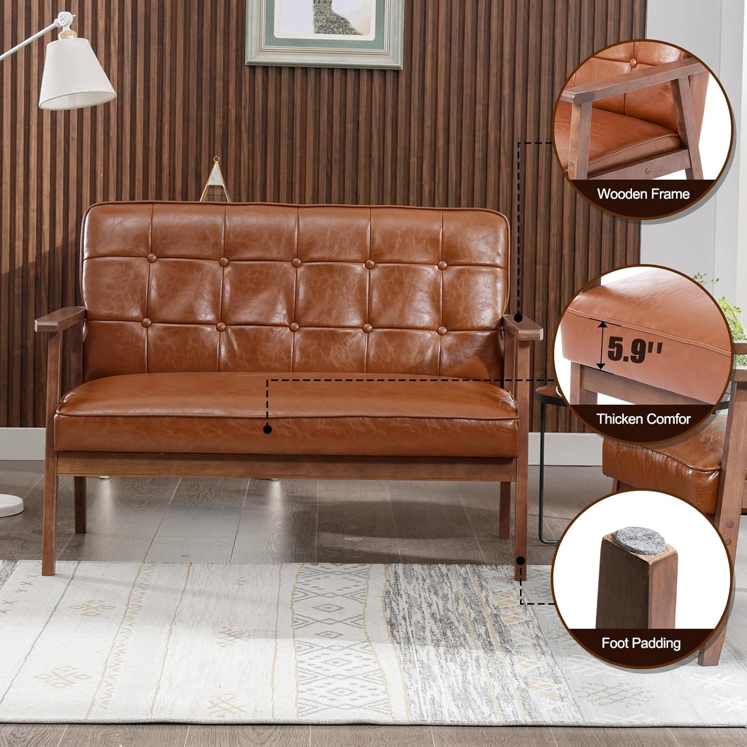 1.【Modern Retro Design】Mid-Century Retro Modern upholstered loveseat sofa set, classical leather and solid wood armrests, combined with button-tufted design, perfect addition to the living room, bedroom, waiting room, guest room.