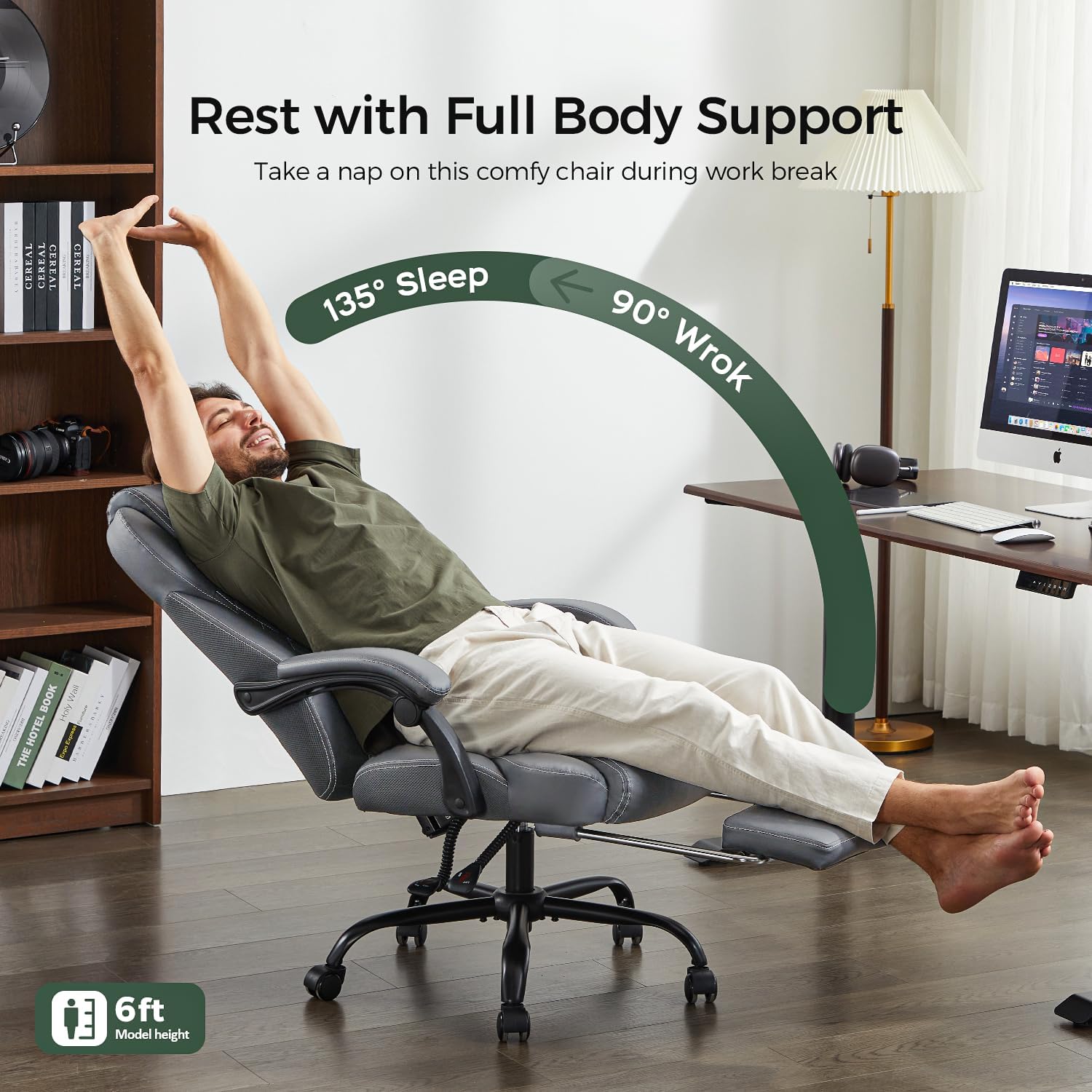 3. Reclining and Adjustable: Adjust the backrest angle from 90° to 135° to suit your work and relaxation needs. The office chair also features a height-adjustable seat and a retractable footrest, allowing you to stretch out and relax during breaks.