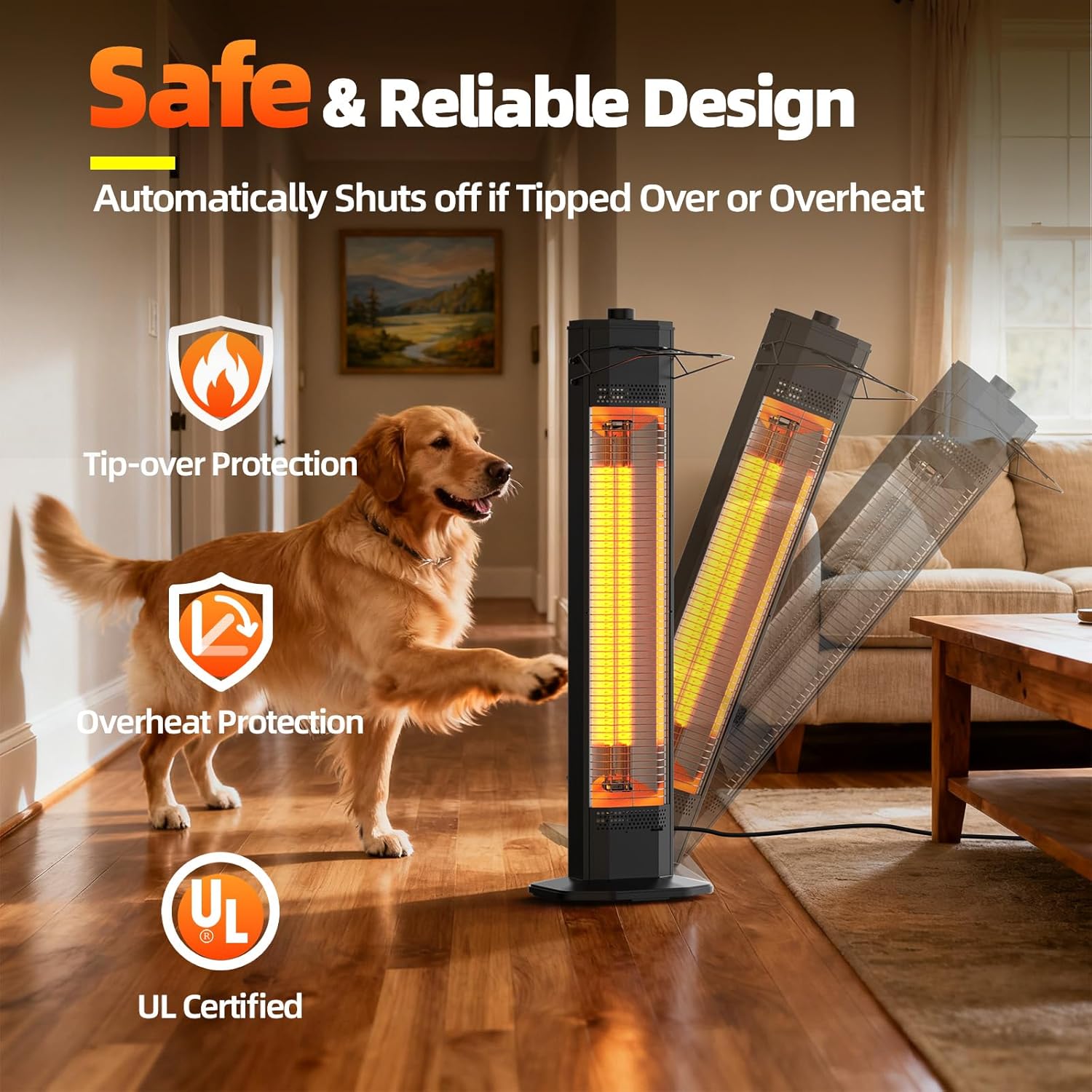 1. Instant Sun-Like Warmth – Experience fast, comforting heat in just 1 second. This 34-inch 1500W infrared patio heater uses dual carbon heating elements to deliver gentle, sun-like warmth without drying the air or making noise—ideal for patios, garages, and living areas.