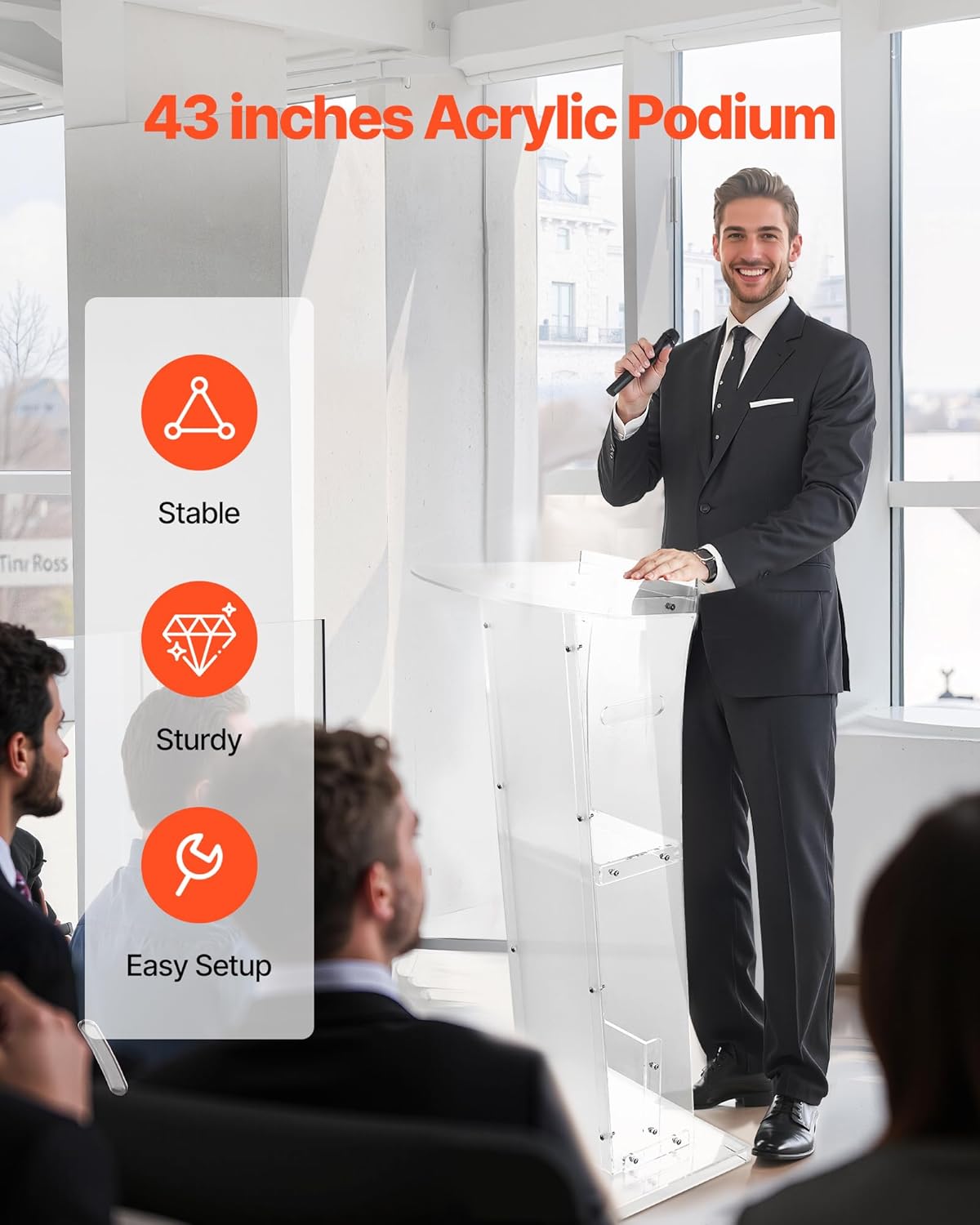 - VEVOR Podium Stand, 43-Inch Acrylic Lectern, Portable Laptop Desk with Wide Reading Surface and Storage Shelf, Book Stopper, Floor-Standing, for Classroom, Wedding, Conference, Lecture and Concert B0FH58DVZS