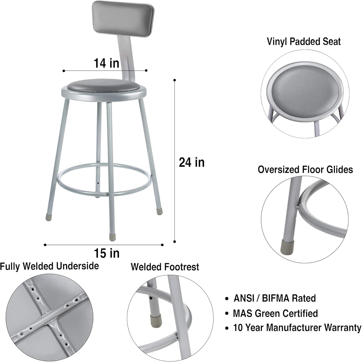 2.【 COMMERCIAL GRADE BUILD QUALITY 】 Padded stools often compress quickly, but we uses a thick vinyl seat over a sturdy steel core with a welded heavy gauge frame and reinforced backrest bracket for long term institutional use. The welded foot ring prevents flex, giving schools, offices, breakrooms, and training spaces a comfortable easy to clean stool that outlasts typical cushioned bar stools.