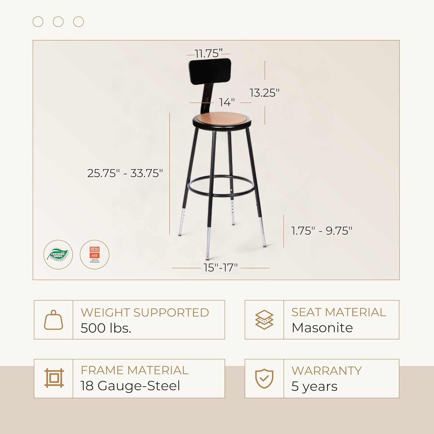 Details: 【The Premium Commercial Stools 】OEF commercial stools provide a unified solution wherever durable seating is needed. Each stool starts with a heavy duty steel frame and integrated foot ring that feels solid underfoot, whether used as a lab stool, classroom stool, shop stool, garage stool, or utility stool. Round and square tops in hardwearing Masonite or easy to clean vinyl create a consistent look across labs, makerspaces, workshops, and training areas, while optional backrests add support for longer sessions at the bench or counter. Heights span classic school standards and counter applications, covering student desk height, counter height seating, and bar height work surfaces. Fixed models serve as reliable school stools and lab stools, while adjustable height stool options bridge between short kitchen stools, counter height stools, and tall bar stools without sacrificing stability. Facilities can standardize with a single commercial stool family instead of juggling random kitchen stools and decorative bar stools that cannot handle daily institutional use. The compact footprint fits under tables and along workbenches where space is tight, creating tidy rows of counter stools in science labs, STEM rooms, and shop classrooms. In front office and service areas, the same steel frame stool functions as an office chair stool, reception stool, or breakroom stool for shared counters and café style tables. For maintenance and trade programs, the design doubles as a rugged workshop stool, workbench stool, or garage shop stool that resists flex and wobble. All models share sturdy steel frame construction with a secure foot ring design that supports comfortable posture. The result is a family of commercial bar stools and classroom furniture stools that works from kitchen island seating and coffee bar counters to demanding lab furniture layouts and vocational shops, giving planners one proven all purpose stool platform for long term use.