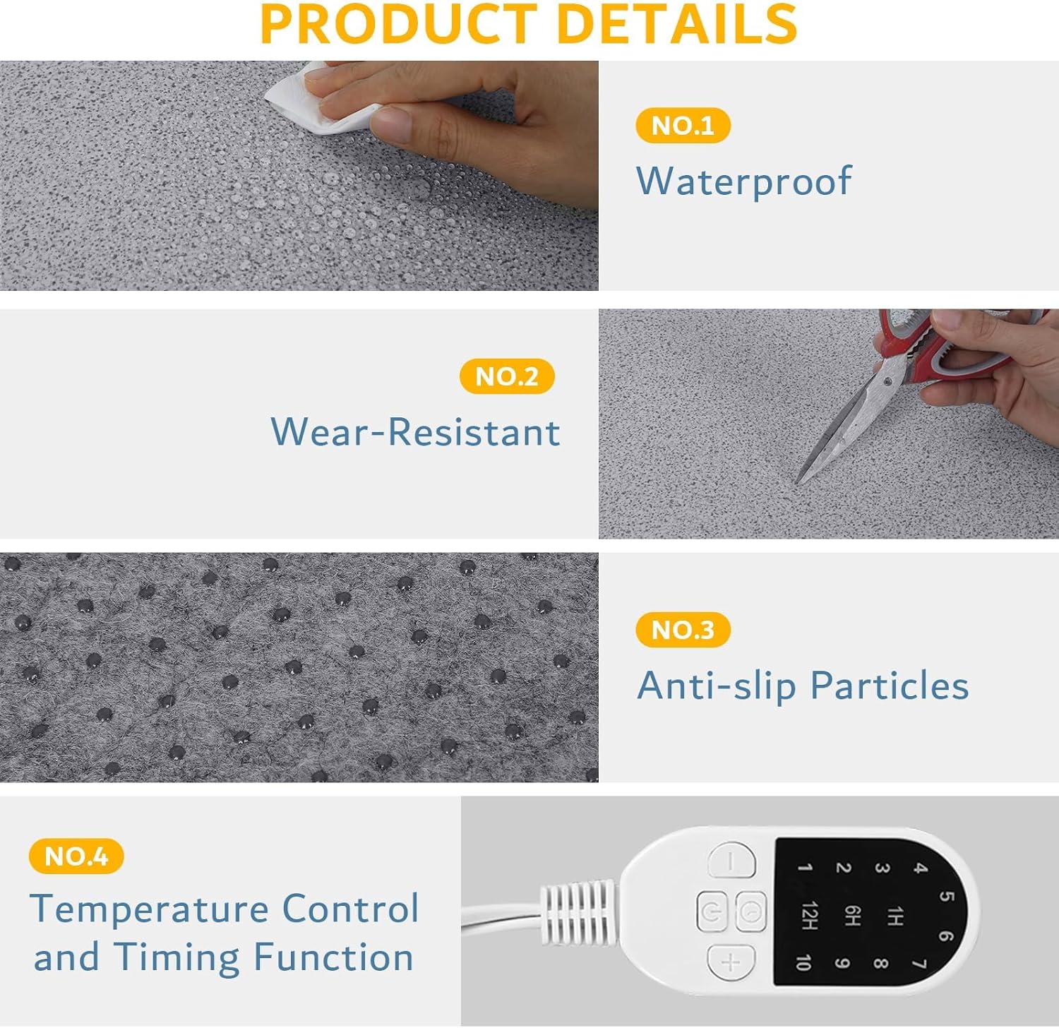 2. Comfortable Heating Design: Crafted as a heated rug for under desks or home use, it offers 10 adjustable heat levels from 45-131°F. The heated rug pad for office ensures even warmth with a non-slip bottom, making it suitable for work spaces or cozying up at home.