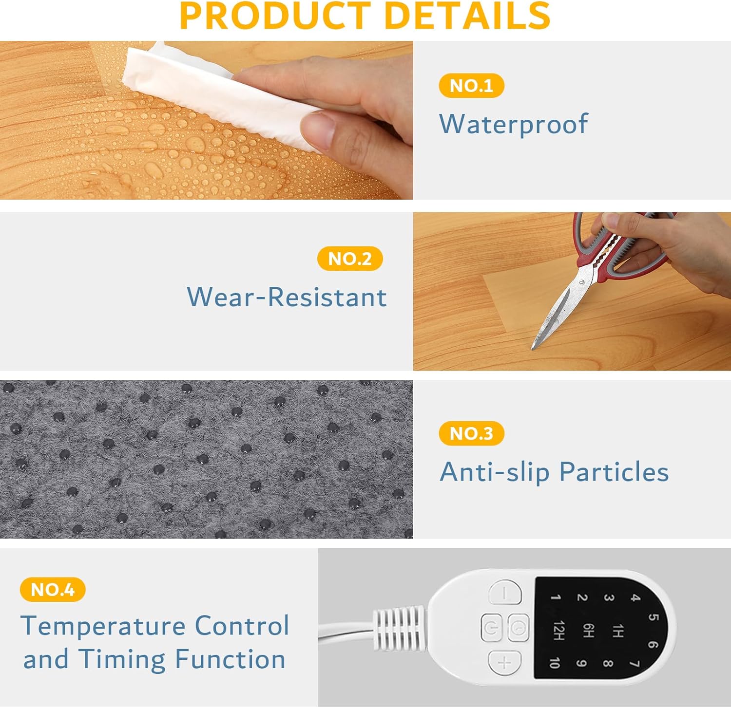 2. Comfortable Heating Design: Crafted as a heated rug for under desks or home use, it offers 10 adjustable heat levels from 45-131°F. The heated rug pad for office ensures even warmth with a non-slip bottom, making it suitable for work spaces or cozying up at home.