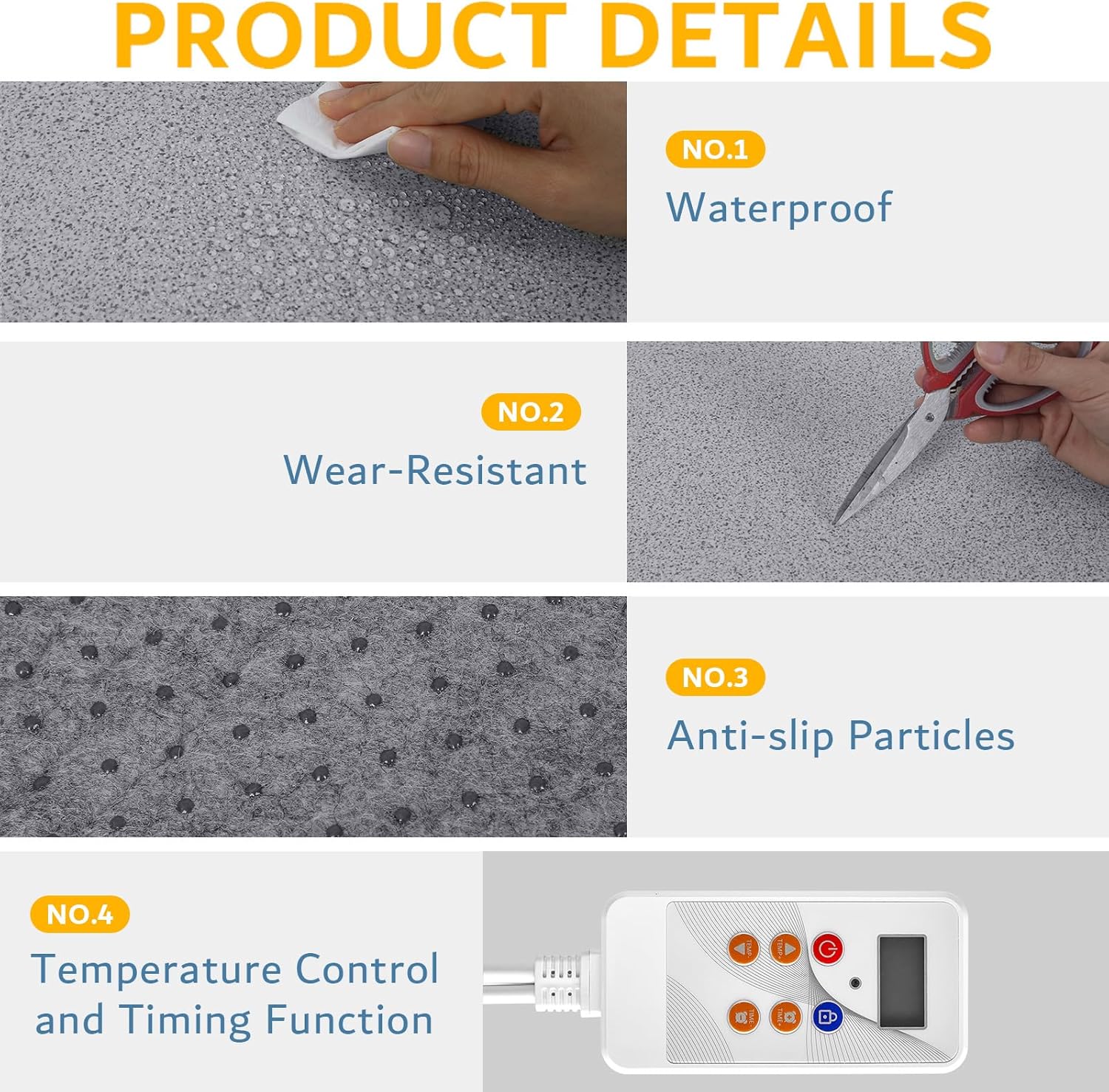 2. Comfortable Heating Design: Crafted as a heated rug for under desks or home use, it offers 10 adjustable heat levels from 45-131°F. The heated rug pad for office ensures even warmth with a non-slip bottom, making it suitable for work spaces or cozying up at home.