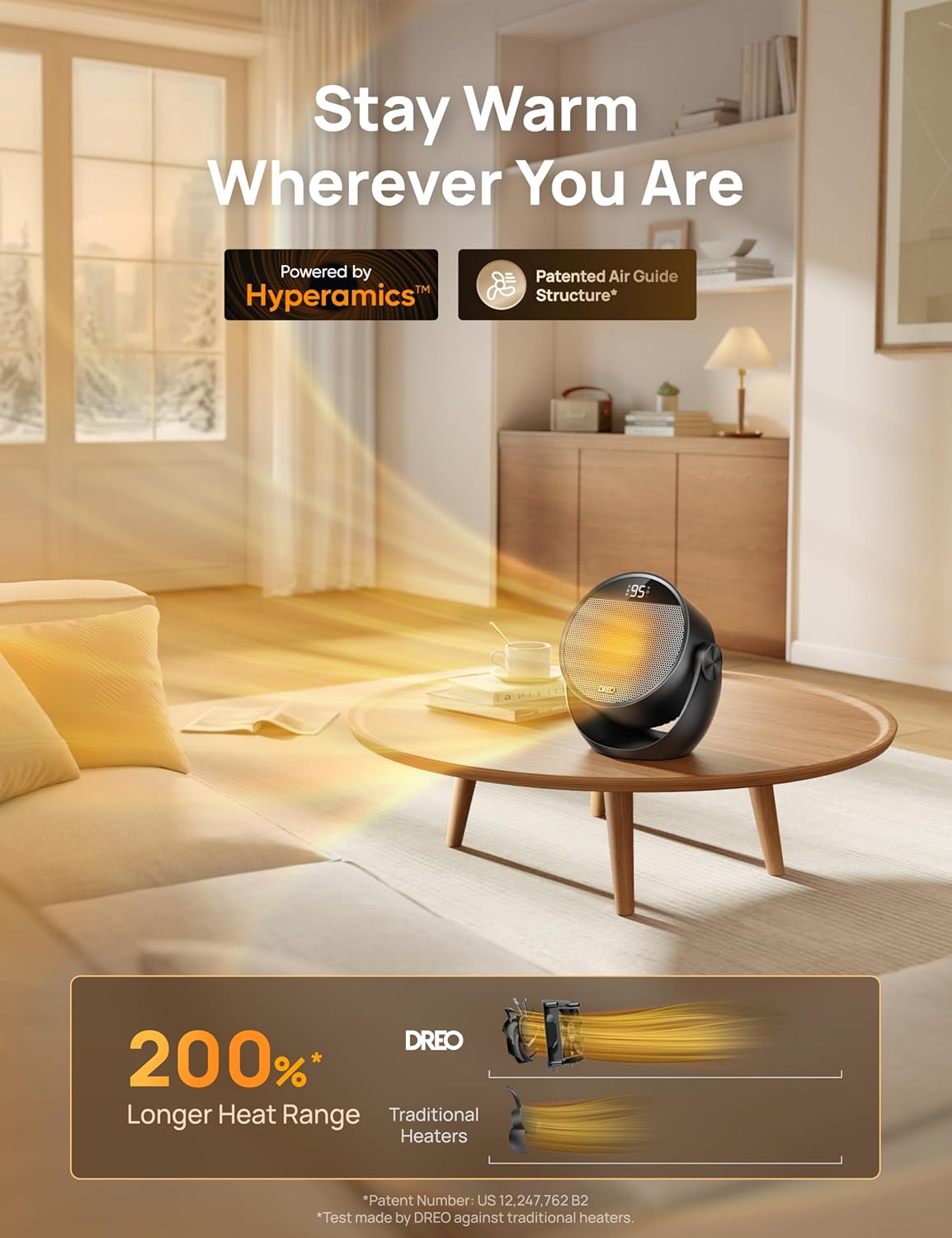 1. Fast Warm Air Delivery: Powered by 1500W Hyperamics tech, this space heater for indoor use delivers warmth in just 2 seconds and produces 53.9% more heated air than traditional heaters
