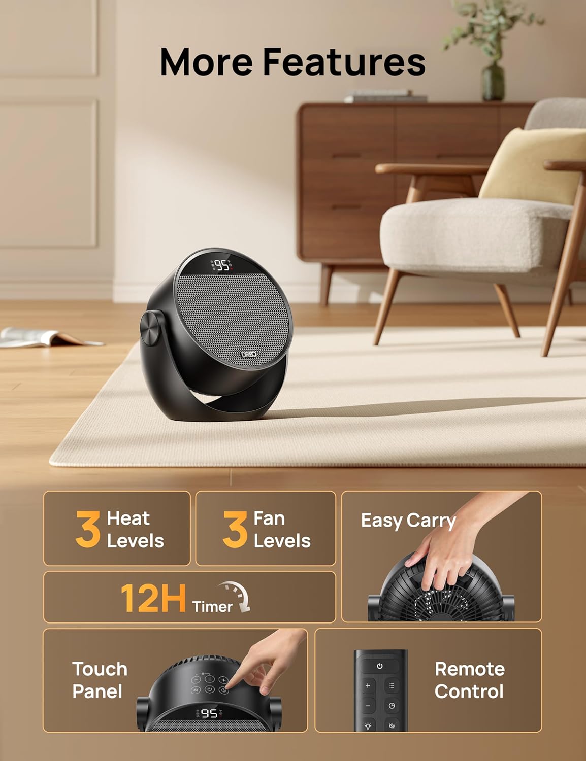 4. Precise Temperature Control: The advanced NTC chipset lets you set your heater for office from 41-95℉ in precise 1℉ increments, delivering smart, energy-saving comfort tailored to your needs
