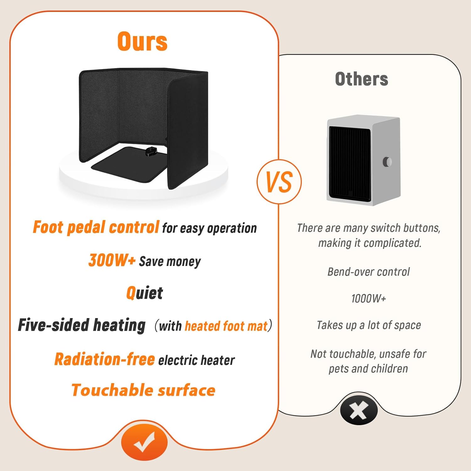 (1) X-Large with Heated Foot Mat - Our foldable space heater equipped with a foot heating pad that heats up quickly, keeping you warm from your feet to your entire body. Additionally, It is features a four-fold design. It not only has a large expanded size(53.6”×21.3”) but also offers greater stability. Provides ample space for movement without feeling cramped.