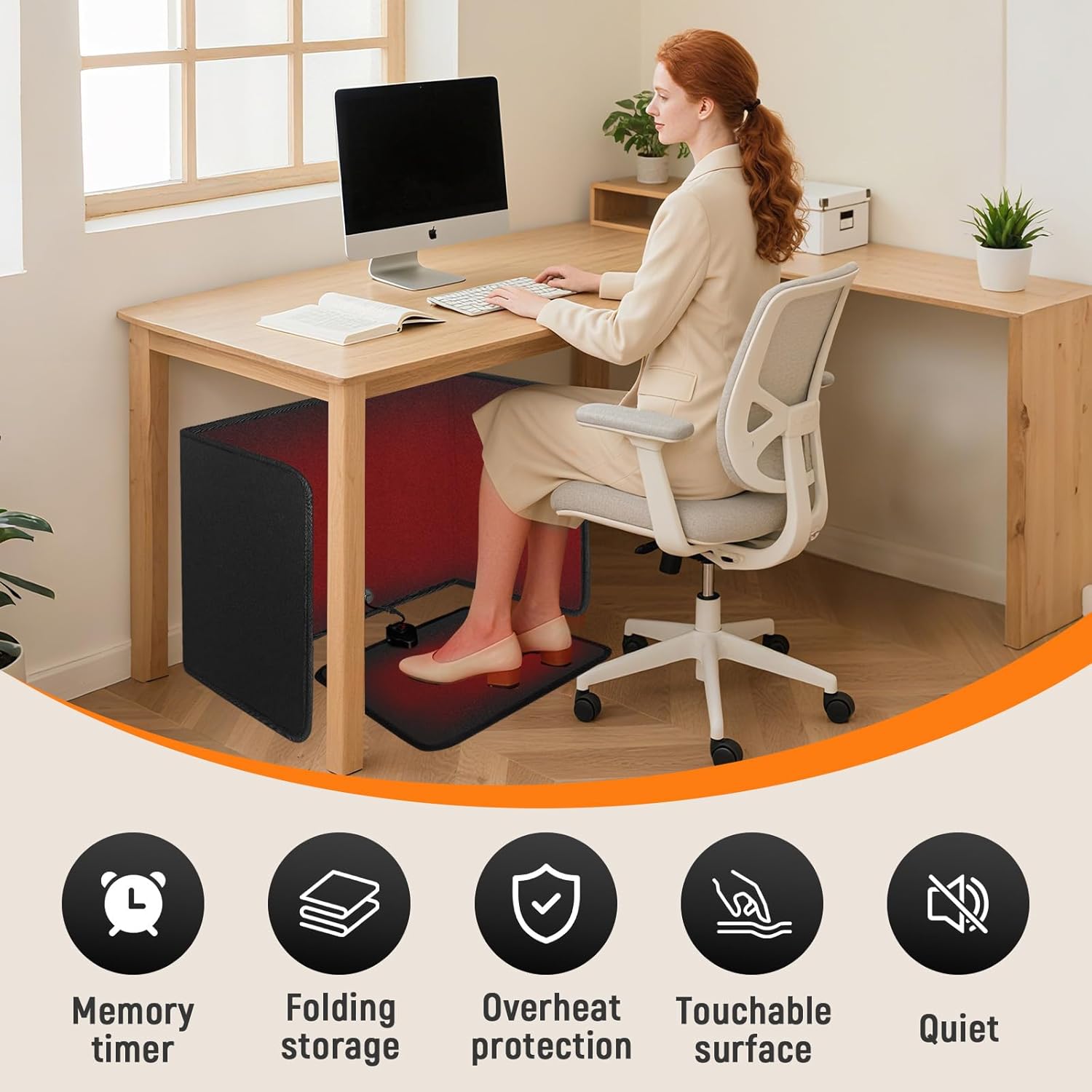 (2) Foot-activated Switch, No Need to Bend Over -The under desk foot warmer is equipped with a simple controller featuring a digital display. Temp:80°F to 150°F;Timer:1-12h.It makes it more convenient for the elderly to use.