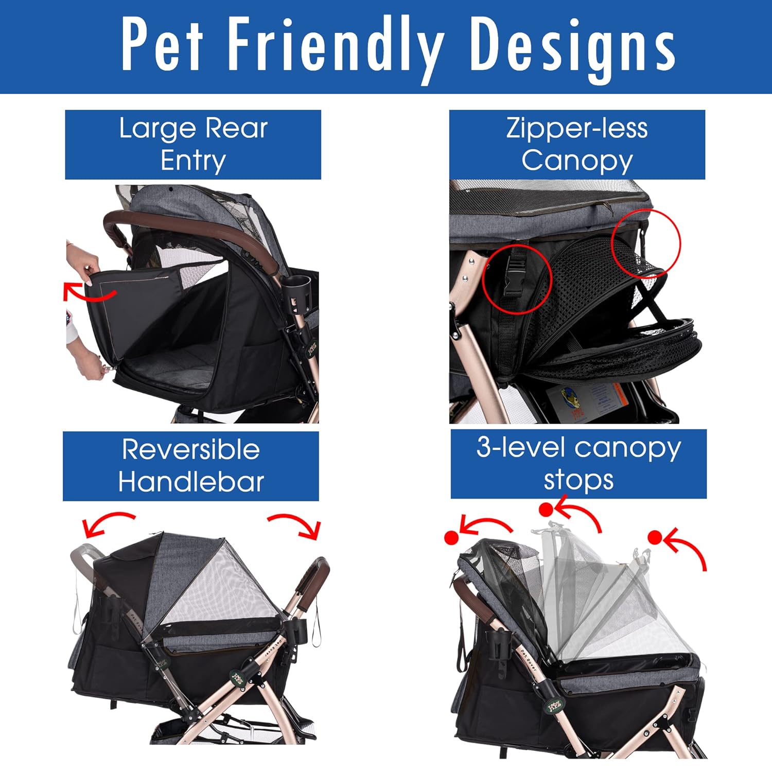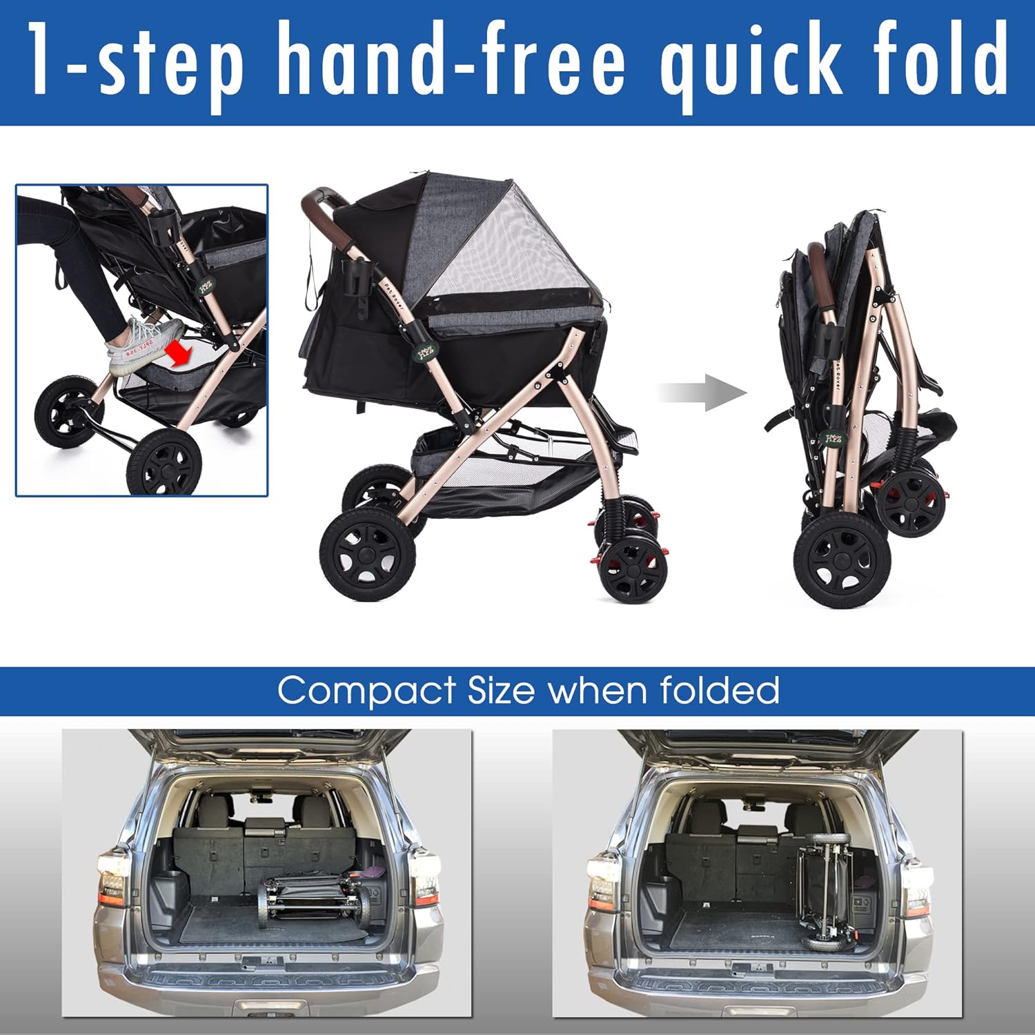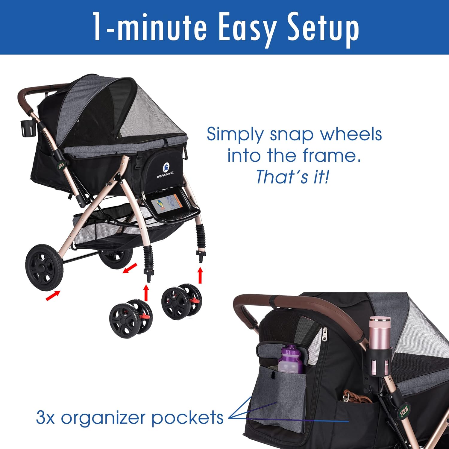 7. PET-FRIENDLY CONVENIENT FEATURES Reversible handlebar and 3-stop canopy opening levels provide viewing flexibility. Large-volume under-basket, three smaller accessory pockets, and a bottle holder offer plenty of storage space when you travel, shop, or stroll with your loved pets. Hand-free one-step quick folding. 1-minute plug and play assembly requires only the snap on of the front and rear wheels which takes less than one minute.